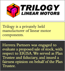Trilogy Systems Corporation - a manufacturer of linear motor components utilizing in the factory automation and logistics market. HPLP served as the fiduciary to the ESOP trustee, in compliance with ERISA, and provided a fairness opinion regarding the sale of the Company.